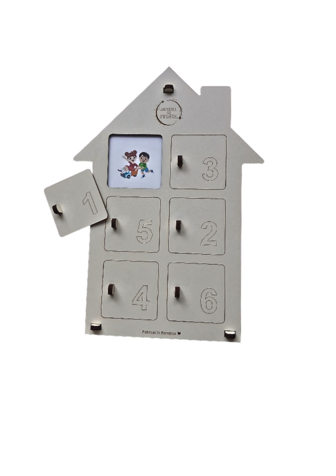 * conținut: 2 plăci A4 în formă de căsuță, 3 planșe cartonate, 1 zar din lemn, 6 piese de puzzle din lemn, instrucțiuni de utilizare.